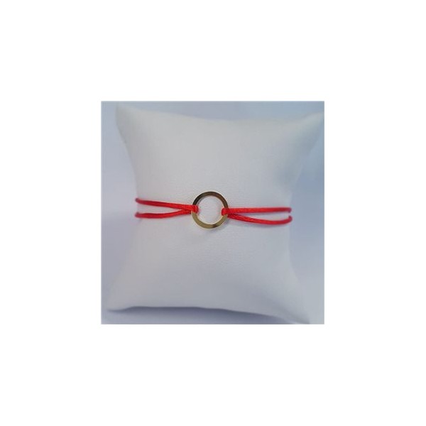 Červený textilní náramek dekorovaný kulatou stříbrnou destičkou