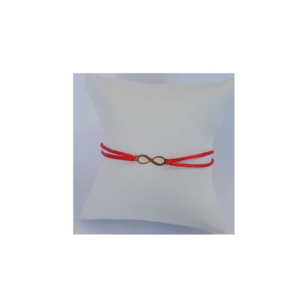 Červený textilní náramek dekorovaný stříbrným přívěskem s motivem nekonečno - infinity. Ozdobný prvek je pokoven vrstvou 14 kt. žlutého zlata.