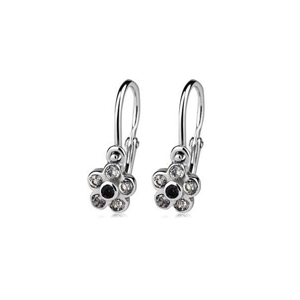 Klasické dětské stříbrné náušnice ve tvaru kytiček dekorovaných čirými a černým zirkonem