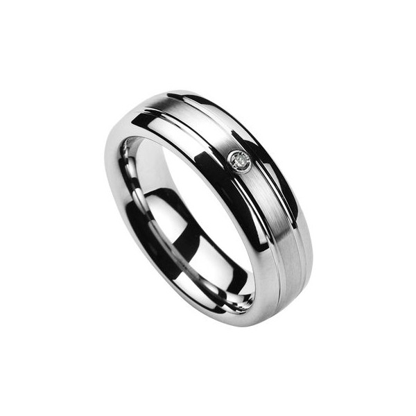 Snubní wolframový prsten zdobený matným pruhem a zirkonem ve středové linii