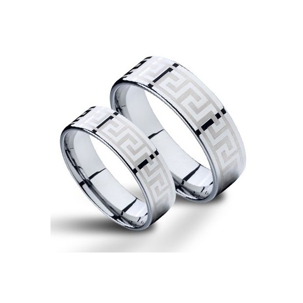 Snubní wolframový prsten v provedení vysoký lesk. Prsten je zdoben řeckým vzorem.