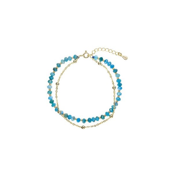 Tento jemný dvojitý náramek spojuje elegantní pozlacený stříbrný řetízek s linií korálků z pravých apatitů v hlubokých modrých až zelených odstínech. Apatit je ceněný pro svou výraznou, energizující barvu, která šperku dodává svěžest a moderní charakter. Pozlacené stříbro 925/1000 zajišťuje teplý zlatavý lesk a zároveň dobrou odolnost vůči opotřebení. Díky karabince a prodlužovacímu řetízku lze náramek pohodlně upravit ze 17 cm o další 4 cm.