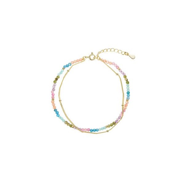Tento stylový dvojitý náramek spojuje zlatavý řetízek z pozlaceného stříbra a barevný mix drobných korálků z pravých kamenů od růžových a oranžových tónů přes zelené až po modré. Kontrast teplého zlata s živou paletou minerálů vytváří výrazný, moderní a radostný design.