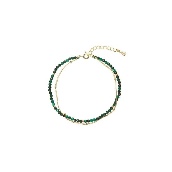 Tento stylový dvojitý náramek spojuje zlatavý řetízek z pozlaceného stříbra a linii drobných korálků z pravého malachitu v bohaté zelené barvě. Teplý odstín zlata se dokonale doplňuje s hlubokými tóny malachitu, díky čemuž šperk působí elegantně a harmonicky. Vyroben ze stříbra ryzosti 925/1000 pokrytého vrstvou zlata. Zapínání na karabinku a prodlužovací řetízek umožňují upravit délku z 17 cm o další 4 cm. Náramek, který dodá každému outfitu kapku luxusu a přírodní energie.