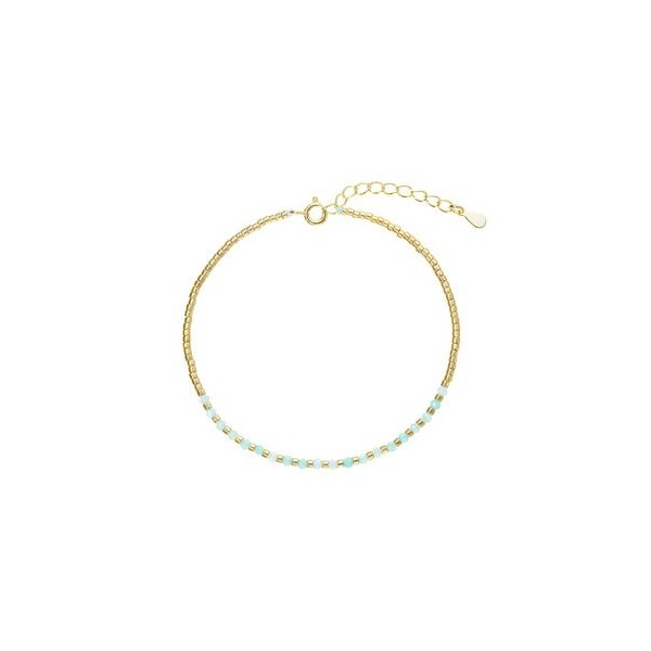 Tento jemný náramek je vyroben z pozlaceného stříbra a zdoben pravými amazonity. Skládá se z drobných zlatavých korálků, které tvoří většinu náramku, a ze sekce světle modrozelených korálků z amazonitu, jež mu dodávají svěží a elegantní vzhled.