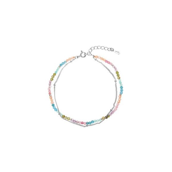 Tento hravý a elegantní dvojitý náramek kombinuje jemný rhodiovaný stříbrný řetízek s linií drobných korálků z pravých přírodních kamenů v pestré barevné paletě. Najdete mezi nimi tóny růžové, oranžové, zelené i modré každý korálek je originál a společně vytvářejí veselý, svěží a lehce bohémský vzhled.