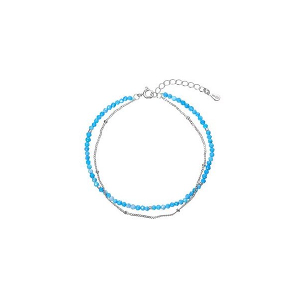 Tento elegantní dvojitý náramek kombinuje jemný stříbrný řetízek a linii drobných broušených korálků z pravého howlitu barveného do výrazné modré barvy. Stříbro ryzosti 925/1000 je opatřeno rhodiovou povrchovou úpravou, která zajišťuje dlouhotrvající lesk a vyšší odolnost proti zčernání. Náramek je vybaven klasickým zapínáním na karabinku a praktickou adjustou, díky níž lze jeho délku upravit z 17 cm až o další 4 cm. Moderní, svěží a lehký šperk pro každý den.