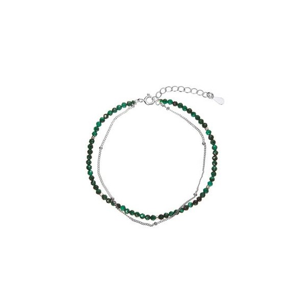 Tento elegantní dvojitý náramek kombinuje jemný stříbrný řetízek s linií drobných broušených korálků ze zeleného malachitu. Sytě zelené tóny malachitu krásně vynikají vedle chladivého lesku stříbra. Náramek je vyroben ze stříbra ryzosti 925/1000 s rhodiovou povrchovou úpravou, která zajišťuje dlouhotrvající lesk a ochranu proti zčernání. Díky zapínání na karabinku a adjustě lze jeho délku upravit z 17 cm o další 4 cm. Jemný, moderní a přitom výrazný šperk pro každý den.