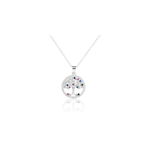 Stříbrný náhrdelník s přívěškem s motivem strom života. Přívěšek je dekorovaný barevnými zirkony - zelenými, modrými, fialovými a čirými