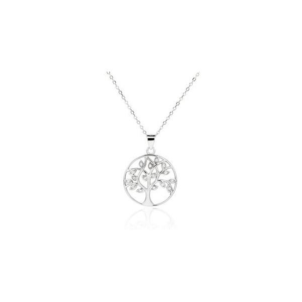 Stříbrný náhrdelník s přívěškem s motivem strom života. Přívěšek je dekorovaný barevnými zirkony - zelenými, modrými, fialovými a čirými
