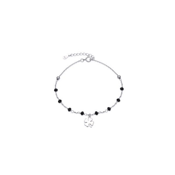 Dámský stříbrný náramek dekorovaný čtyřlístkem a broušenými korálky černé barvy