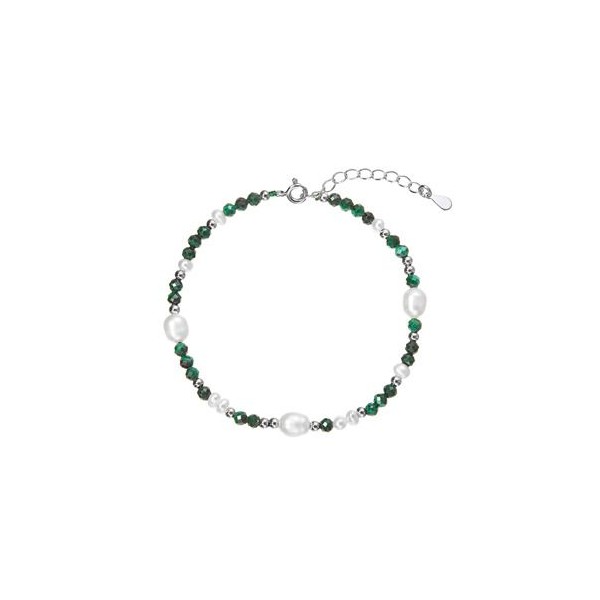 Tento elegantní náramek je tvořen pravými říčními perlami různých tvarů a drobnými korálky malachitu v sytě zelené barvě. Jemný perleťový lesk perel se nádherně doplňuje s výraznou zelení malachitu, která šperku dodává svěžest, přírodní energii a jedinečný charakter.