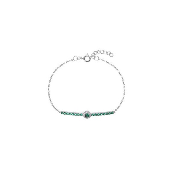 Uprostřed zdobí náramek kulatý zelený zirkon orámovaný drobnými čirými kamínky, které zvýrazňují jeho barvu a hloubku. Linie pokračují řadou drobných zelených zirkonů, jež vytvářejí harmonický a luxusní efekt.