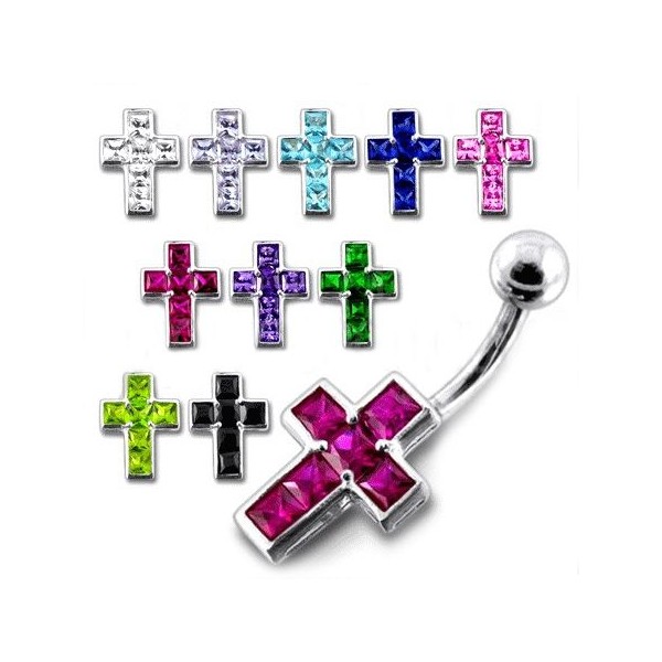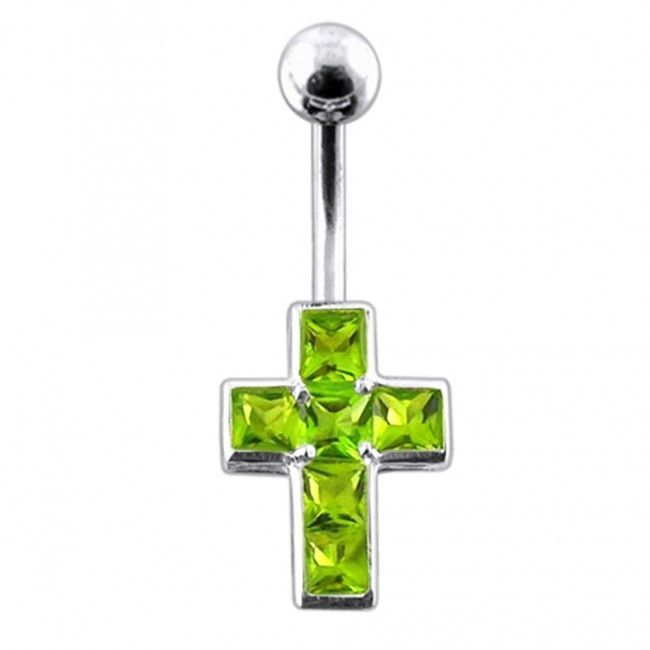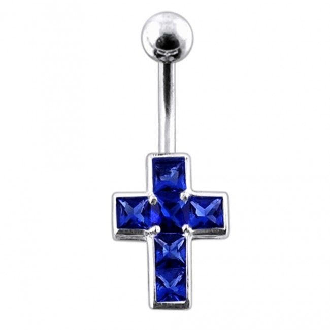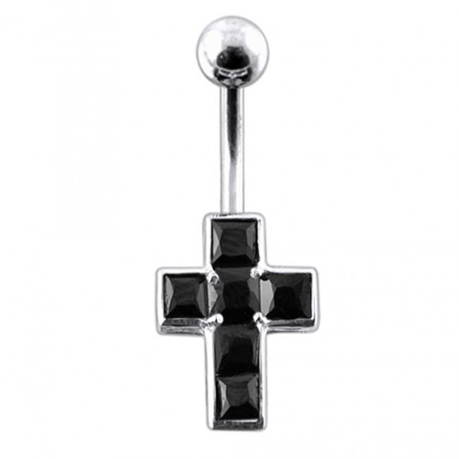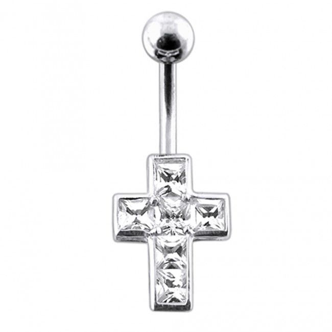 Stříbrný piercing do pupíku ve tvaru křížku zdobeného zirkony