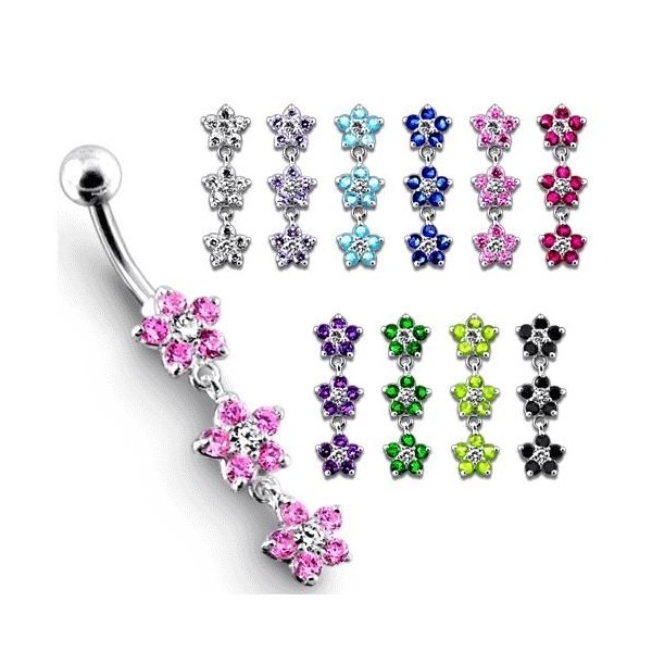Visací stříbrný piercing do pupíku zdobený kytičkami