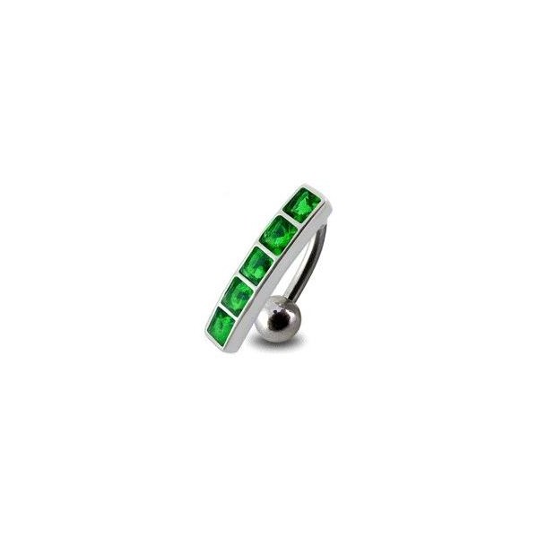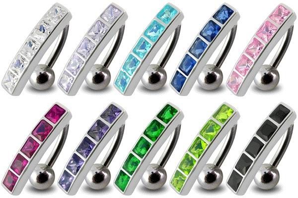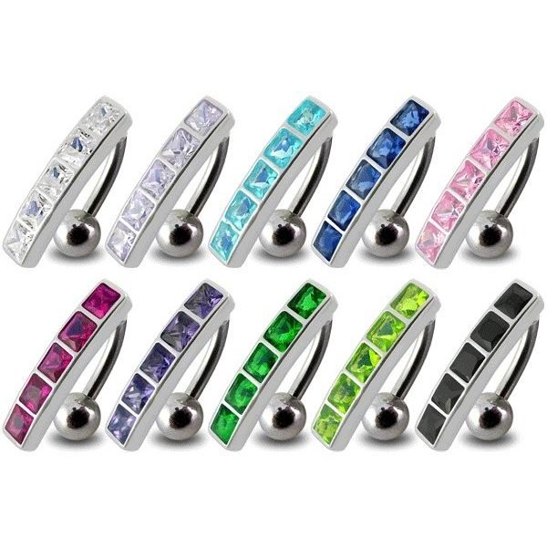 Obrácený stříbrný piercing do pupíku se štítem zdobeným čtvercovými zirkony