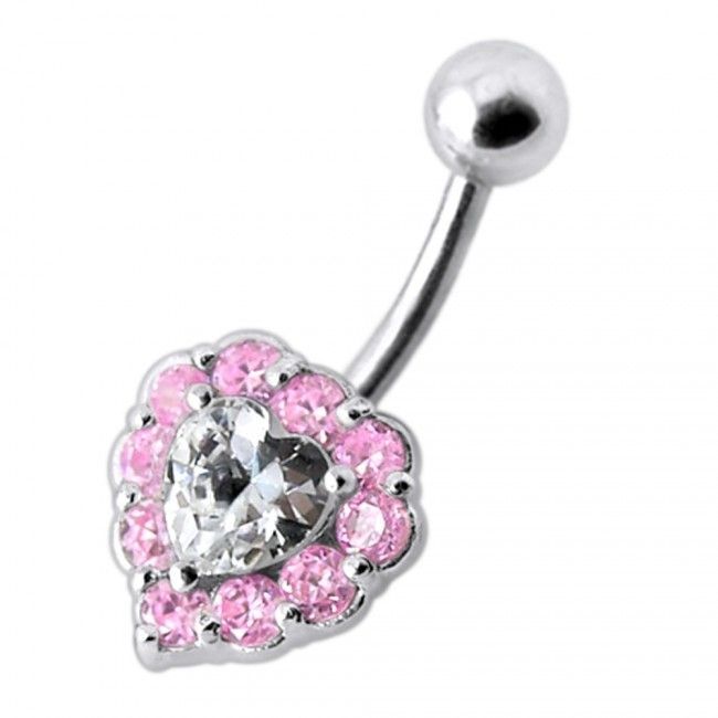 Stříbrný piercing do pupíku ve tvaru srdíčka zdobeného kubickými zirkony