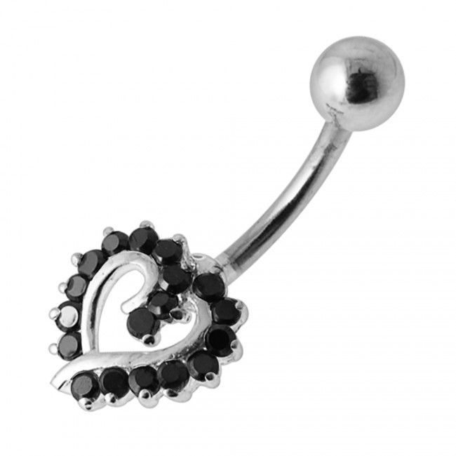 Stříbrný piercing do pupíku ve tvaru srdíčka zdobeného zirkony