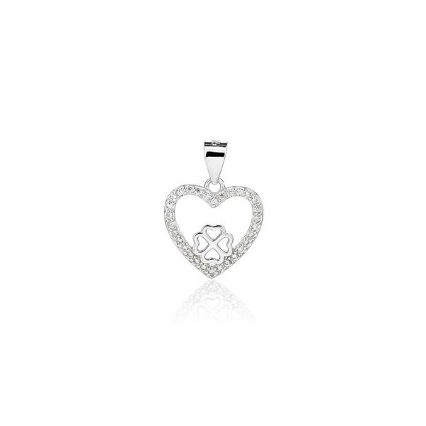 Stříbrný přívěsek ve tvaru srdíčka uvnitř kterého je umístěn čtyřlístek