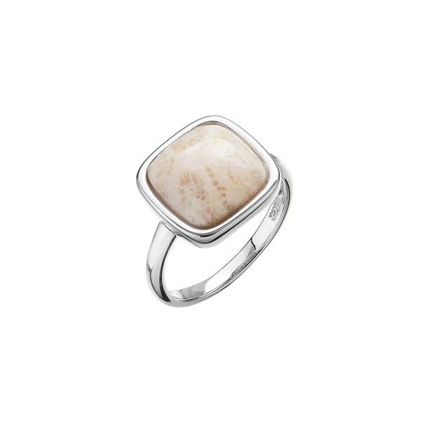 Prsten je vyroben z ryzího stříbra 925/1000 s precizní rhodiovou úpravou, která zajišťuje mimořádný lesk a ochranu před oxidací. Čtvercové stříbrné lůžko ukrývá výjimečný fosilní korál v přírodních zemitých tónech - každý kus je naprosto unikátní, stejně jako jedinečná je i žena, která jej nosí. Struktura kamene samotné vypráví příběh tisíciletí ukrytých v mořských hlubinách, dávných ekosystémů a nepřetržitého procesu proměn.