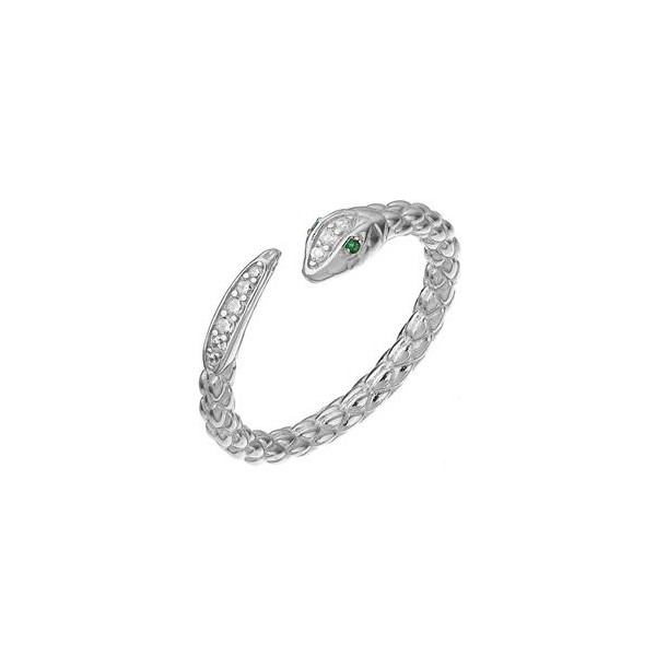 Tento oblíbený prsten, kterým je obtočený had kolem vašeho prstu je vyroben ze stříbra o ryzosti 925/1000 a je opatřen vrstvou rhodia, která šperk ochrání před zčernáním, zežloutnutím nebo poškrábáním. Na místě očí hada jsou vsazené zelené zirkony.