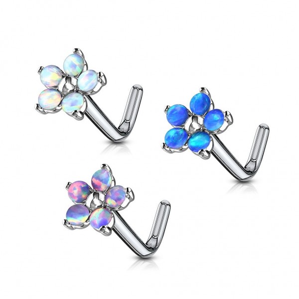Zahnutý piercing do nosu zdobený syntetickými opály